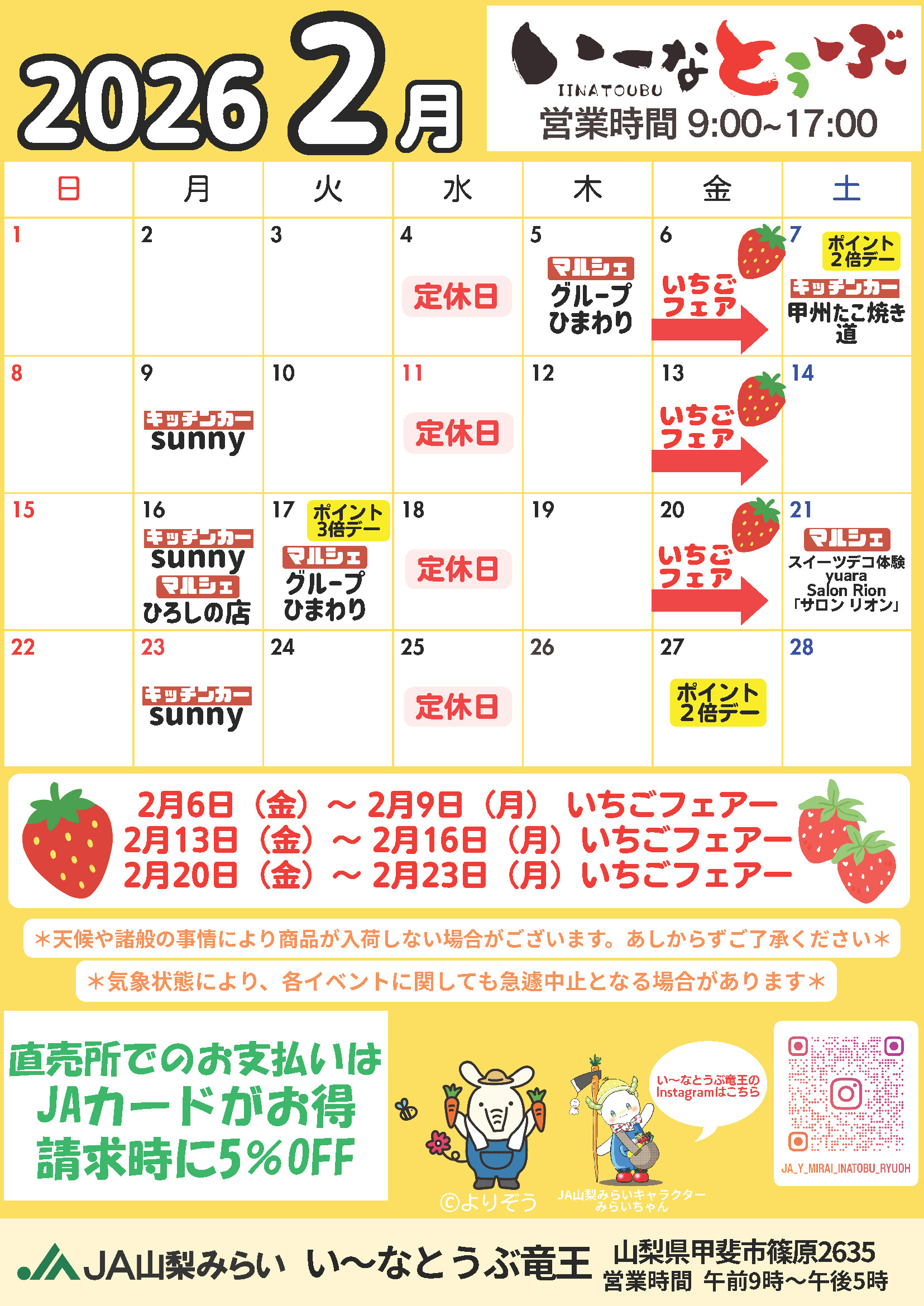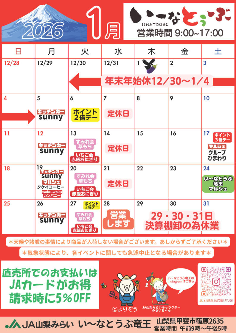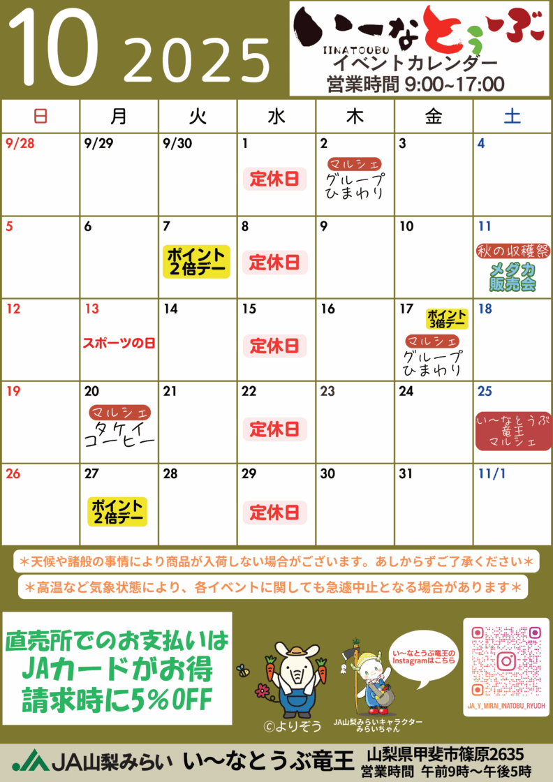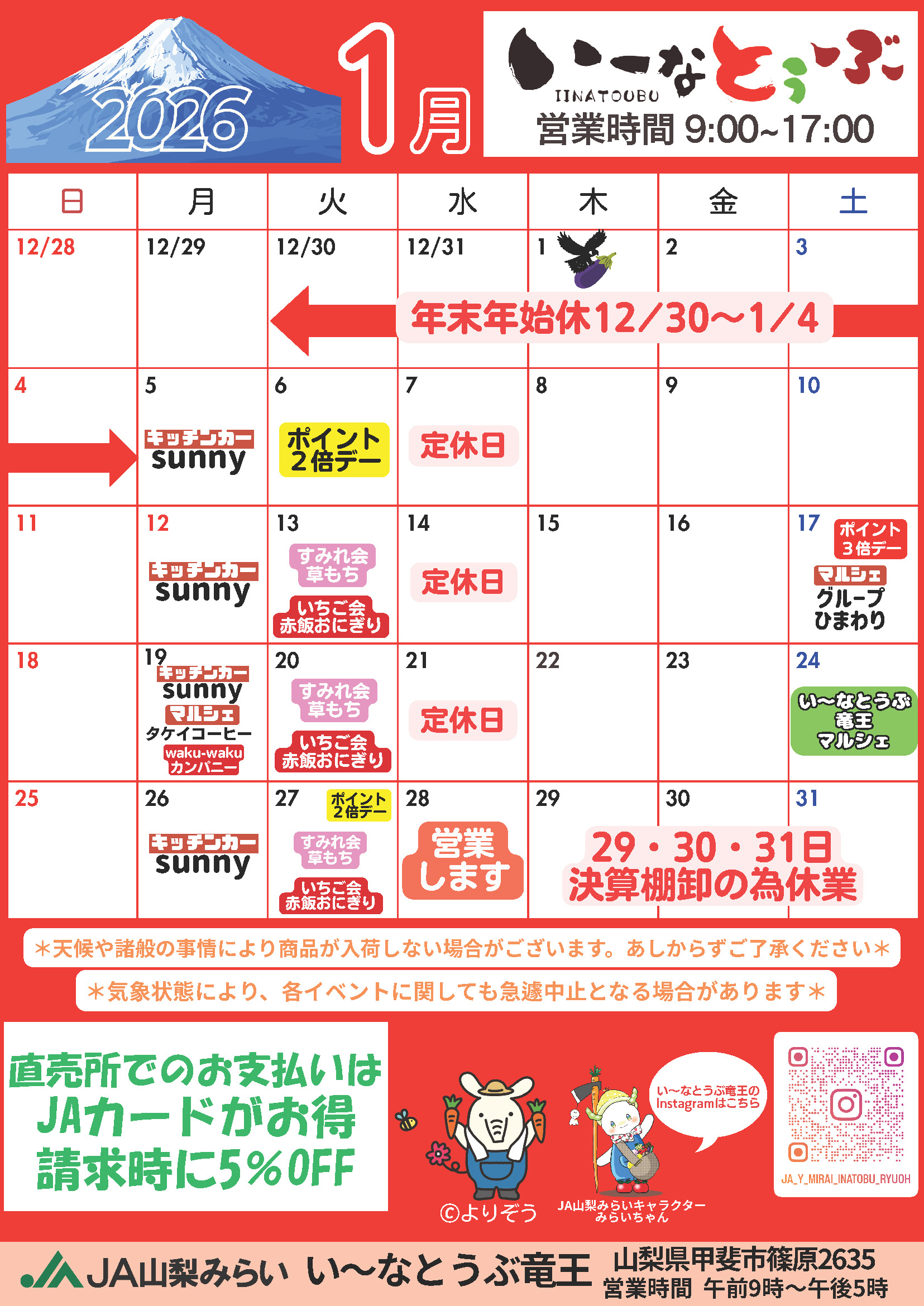 JA山梨みらい管内(甲斐市、中央市、昭和町ほか)にて生産された、新鮮で安全な野菜や果実を豊富に取り揃えて安価に提供しております。JAのお店だからこそ出来る親切丁寧な対応、時には生産者ともふれあえ交流できる、ご来店される全てのお客様に優しい温かい直売所です