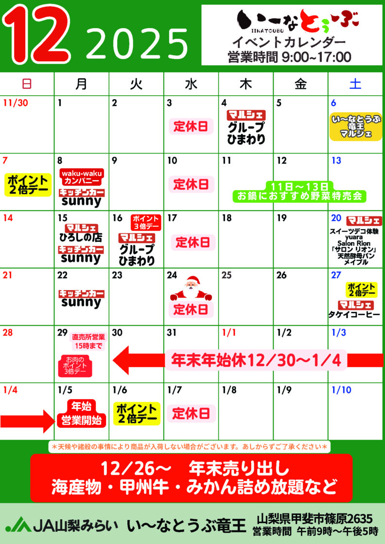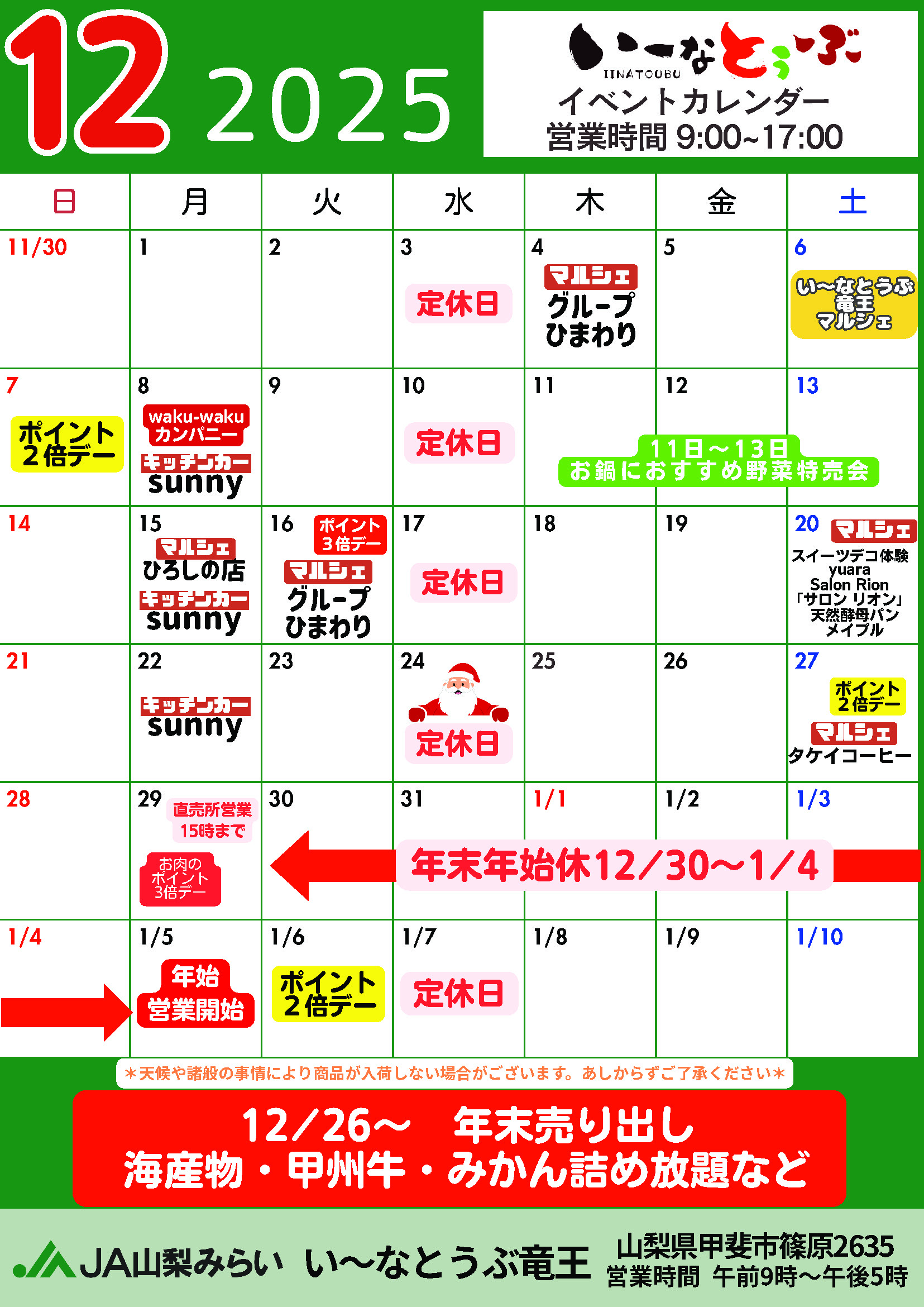 | 定休日 | 水曜日 1・7月末日(平日の最終日) 年末年始 |
