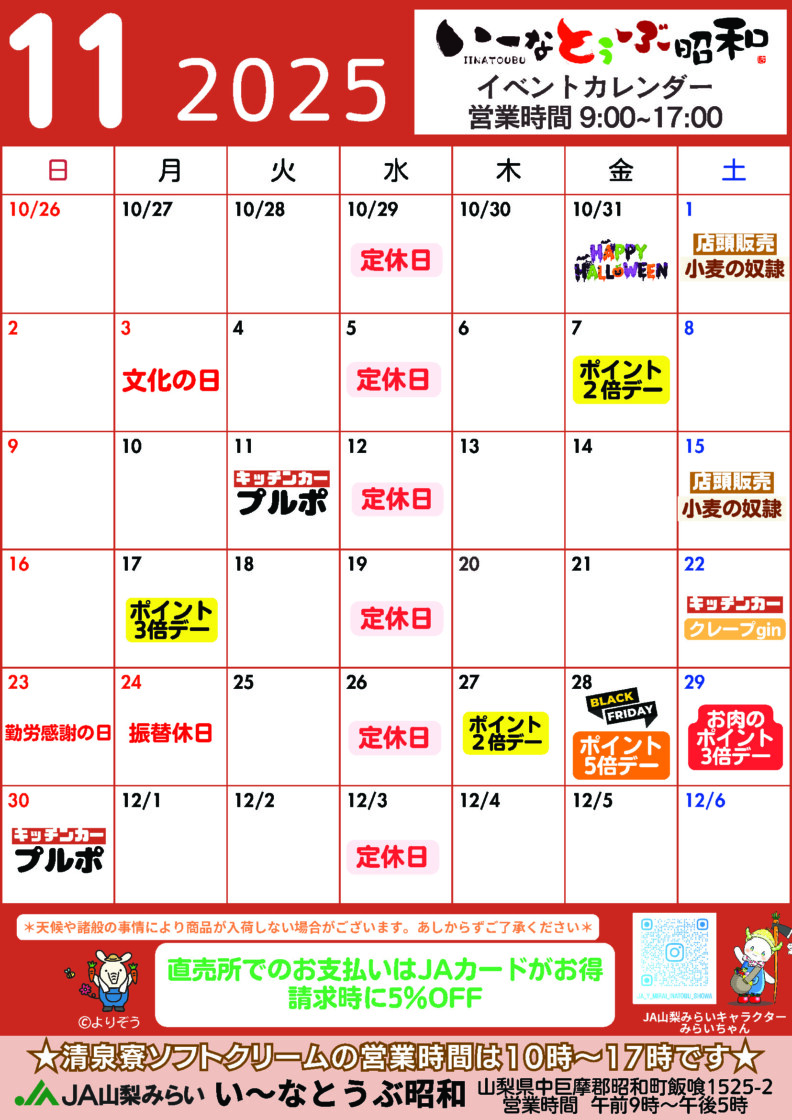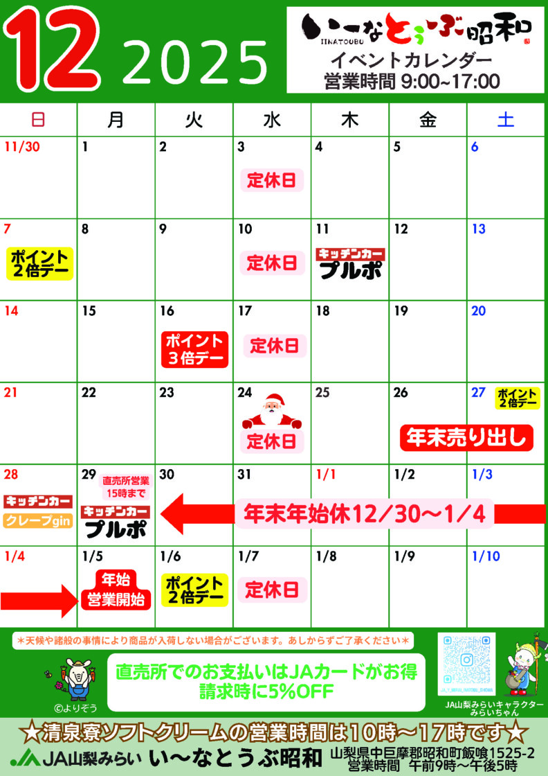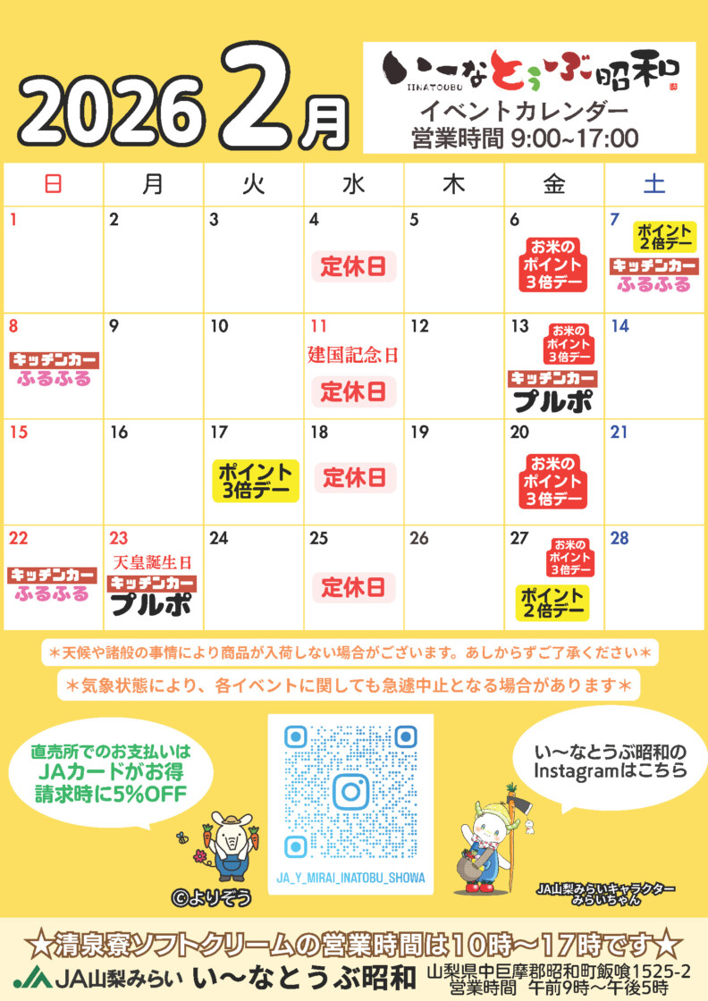 直売所には昭和町産の旬な新鮮野菜や地元有名店の加工品が並ぶほか、イベントやお祭り等の移動販売以外では全国でも初となる『清里清泉寮のソフトクリーム』も専門コーナーを設けて販売しています。