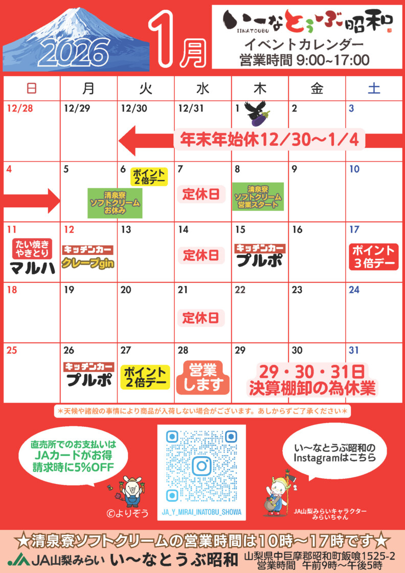 直売所には昭和町産の旬な新鮮野菜や地元有名店の加工品が並ぶほか、イベントやお祭り等の移動販売以外では全国でも初となる『清里清泉寮のソフトクリーム』も専門コーナーを設けて販売しています。
