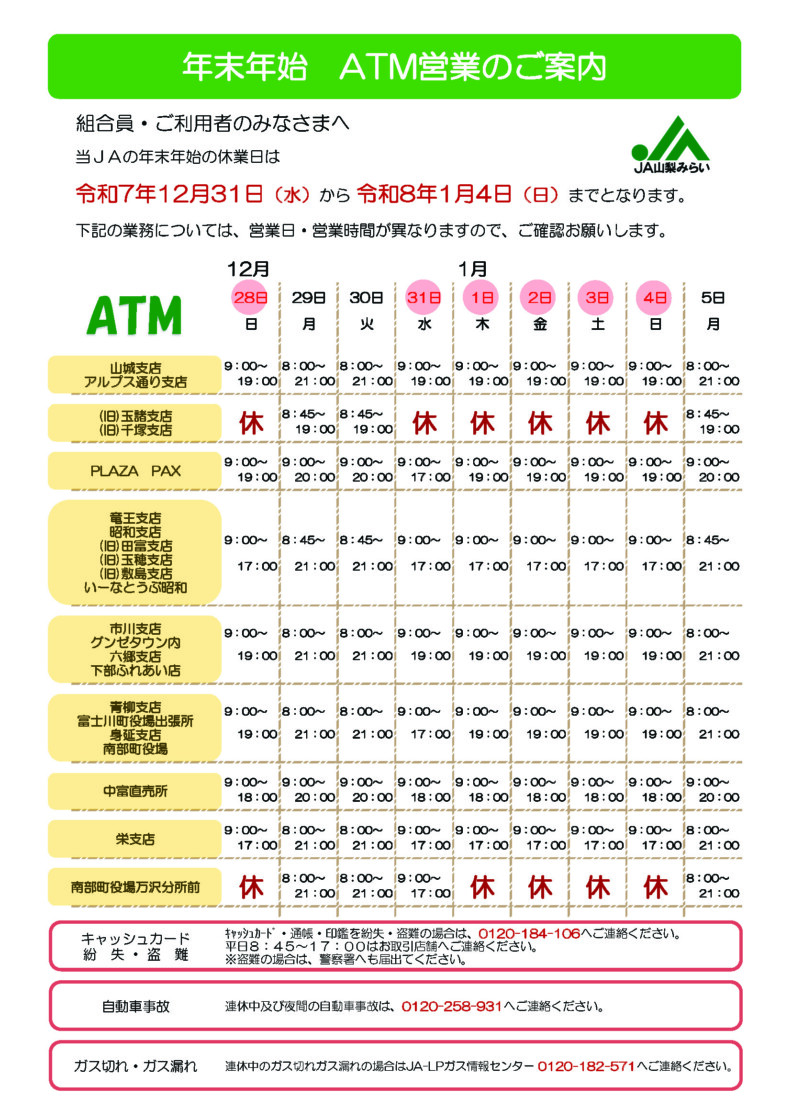 各事業所および管内ATM等の年末年始の営業日につきましては、次の通りです。