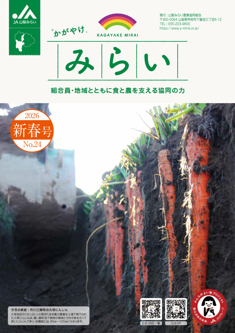 2025.12.24 お知らせ かがやけみらいNo.24(新春号) P3 新年のご挨拶P4-5 山梨県JA統一企画 6JAのビッグニュースP6-7 トピックスP8 女性部活動報告、JA共済書道・ポスターコンクールP9 農業者賠償責任共済のご案内P10 相続・税務相談会のお知らせP11 セレモニーホールからのお知らせ、理事会報告 過去の広報誌についてはこちら