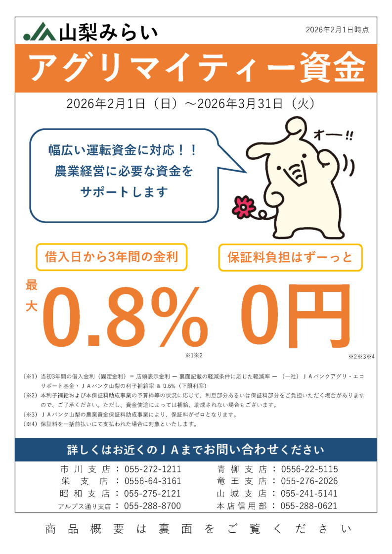 山梨みらい農業協同組合(以下、「当JA」とする。)は、経営者保証に関するガイドライン研究会(全国銀行協会及び日本商工会議所が事務局)が公表した「経営者保証に関するガイドライン」を踏まえ、本ガイドラインを尊重し、遵守するための態勢整備を実施致しました。