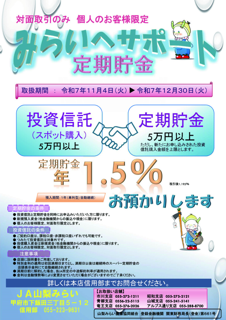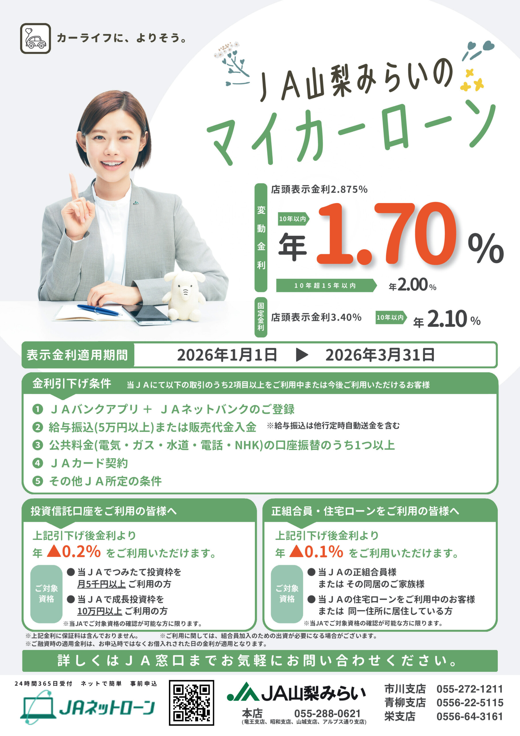 JAバンクは皆さまの暮らしに役立つ、身近で便利な総合金融機関です。組合員はもちろん、地域のみなさまや事業主の皆さまから貯金をお預かりしております。